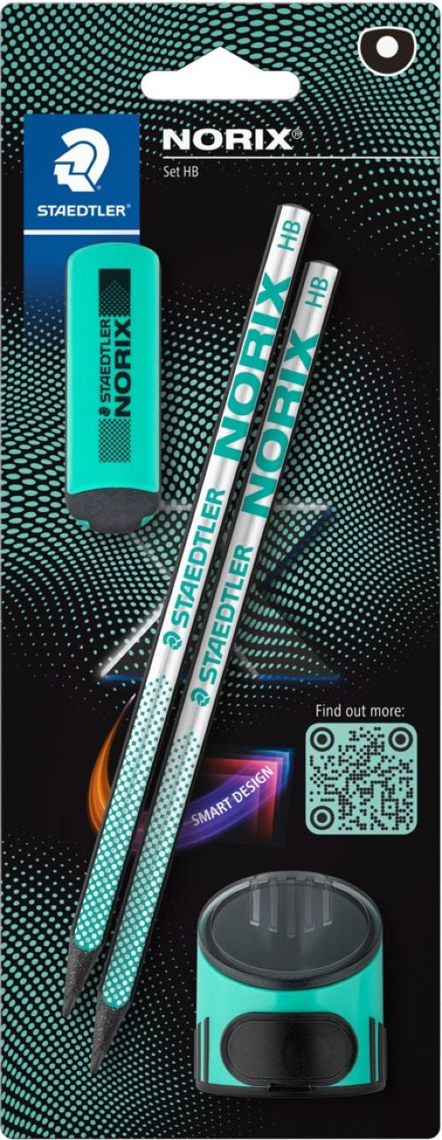 Blister 2 lápiz de grafito norix + afilalápices + goma turquesa